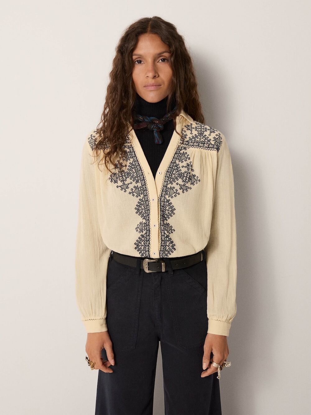 Deep navy embroidery adorns the chest and shoulders, flowing like delicate vines for a hand-crafted, artisanal touch.