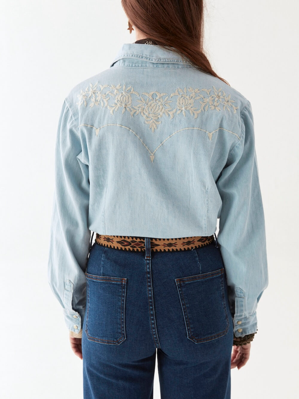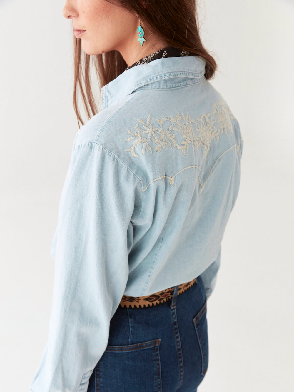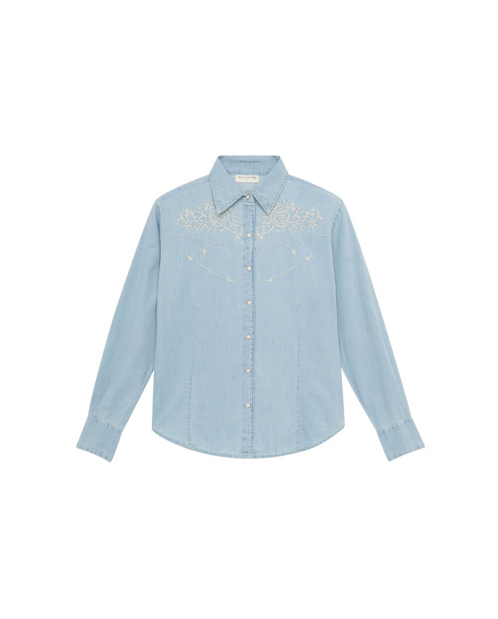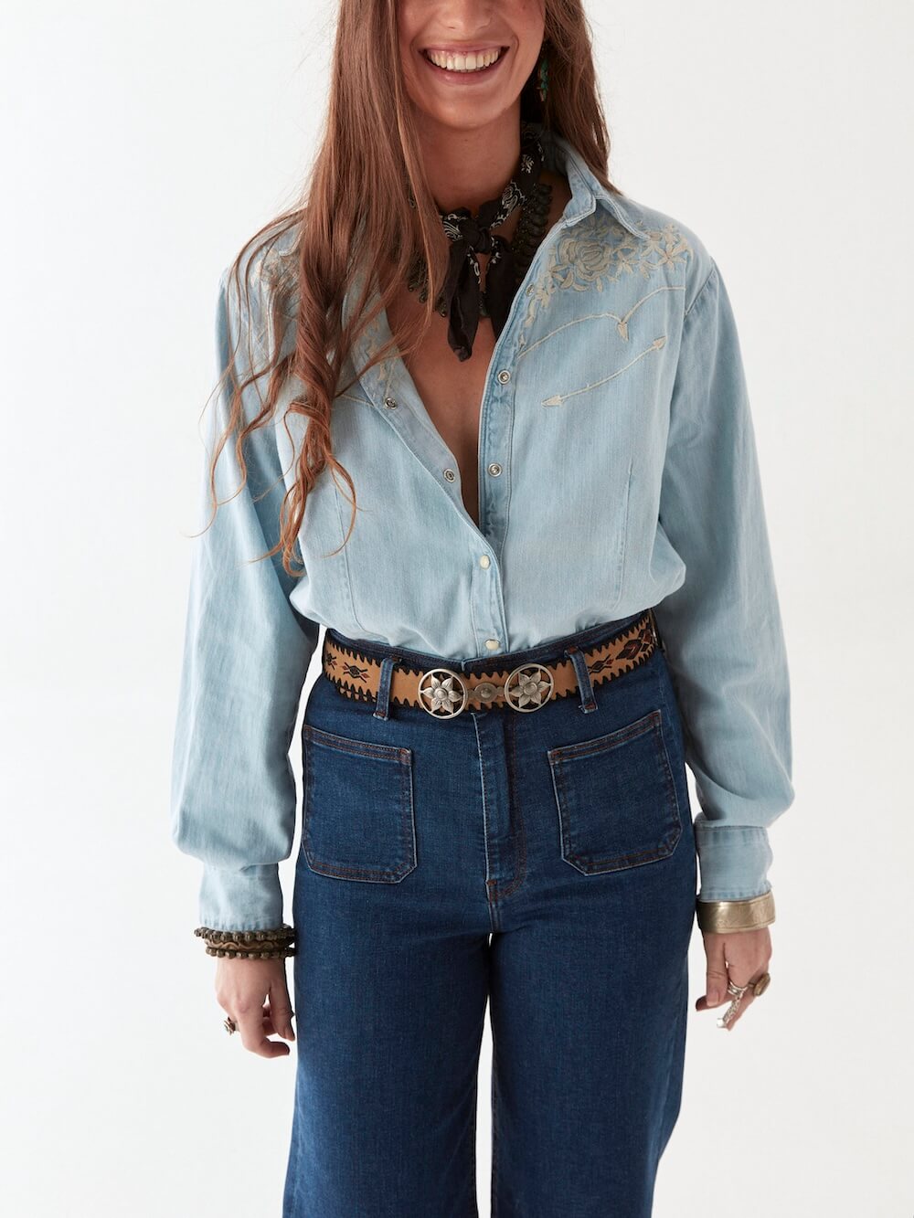 The Austin Blouse in Mustang Blue by Maison Hotel captures the spirit of vintage denim with a modern twist. Crafted from 100% soft cotton, this Western-inspired blouse features a gently faded baby blue wash, detailed floral and arrow embroidery across the chest, and a structured collar for timeless appeal.