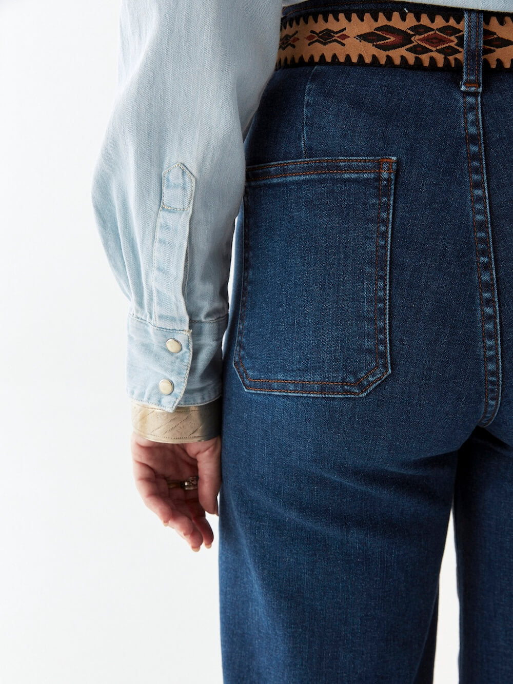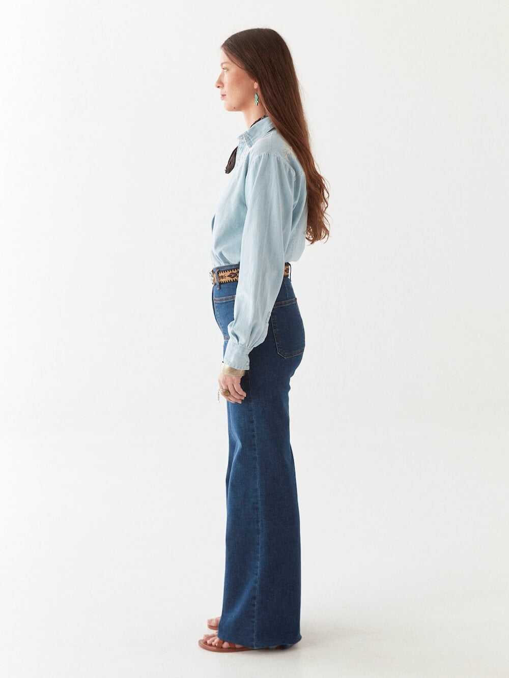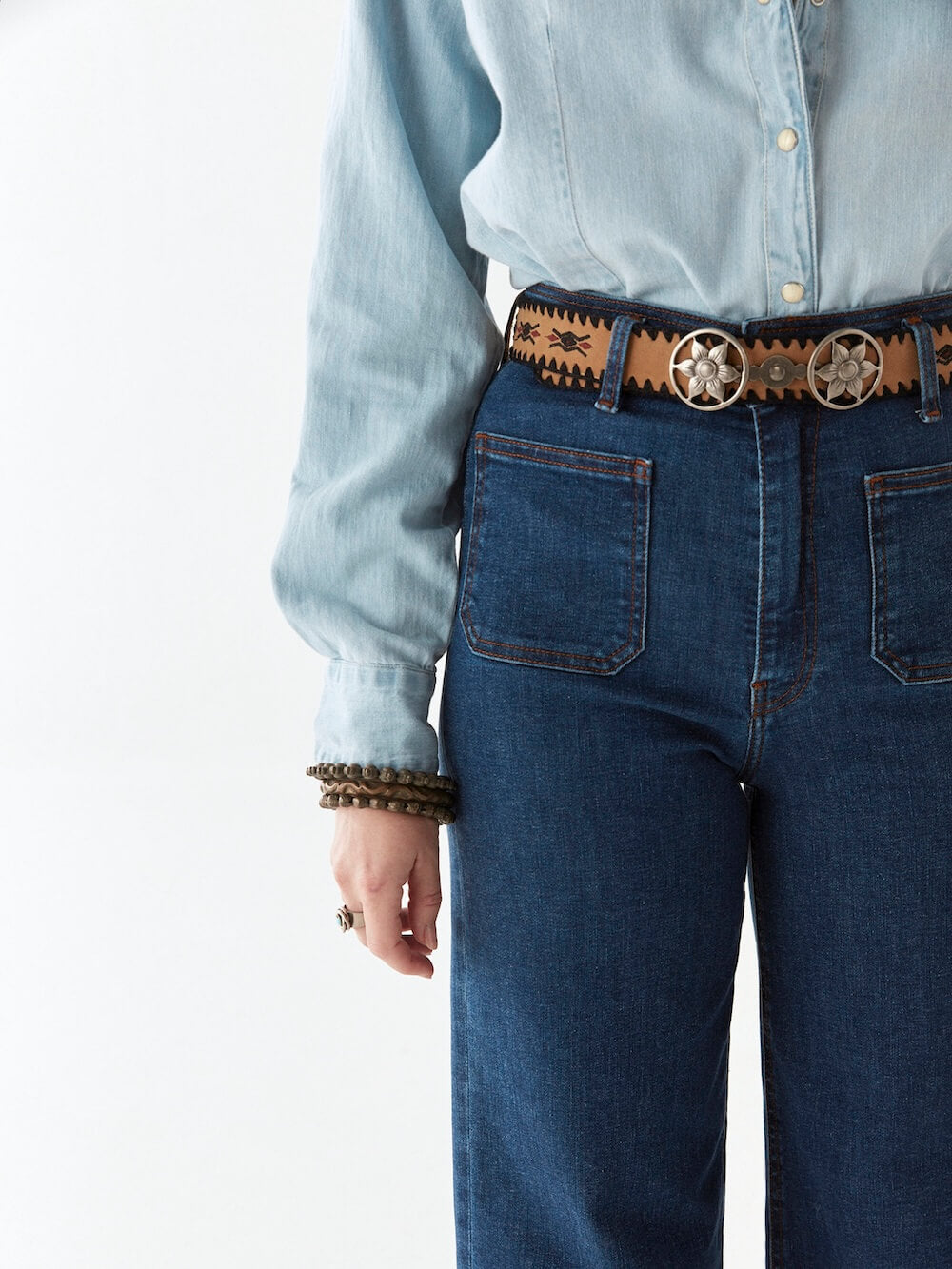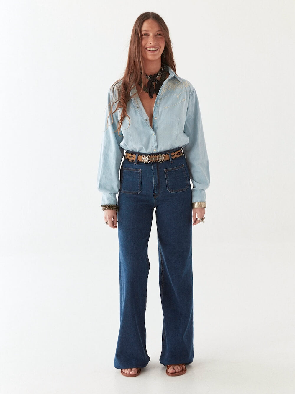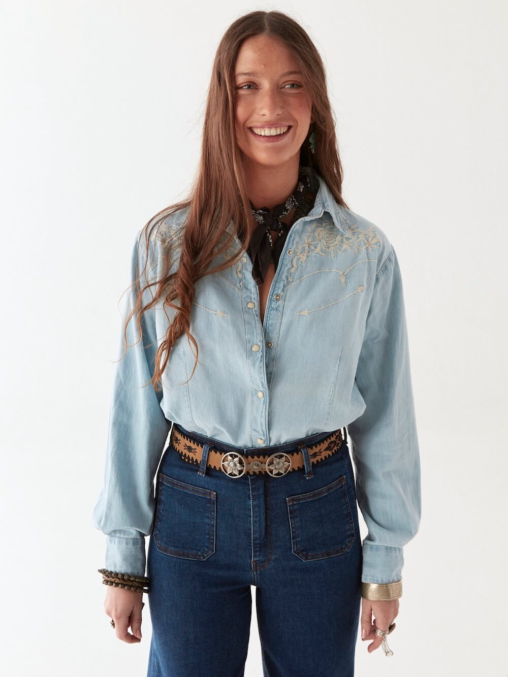 The Austin Blouse in Mustang Blue by Maison Hotel captures the spirit of vintage denim with a modern twist. Crafted from 100% soft cotton, this Western-inspired blouse features a gently faded baby blue wash, detailed floral and arrow embroidery across the chest, and a structured collar for timeless appeal.