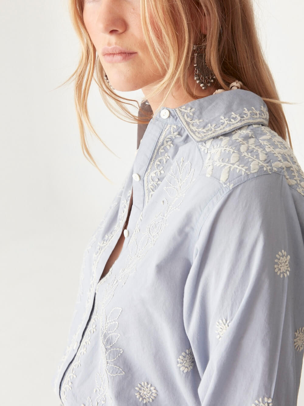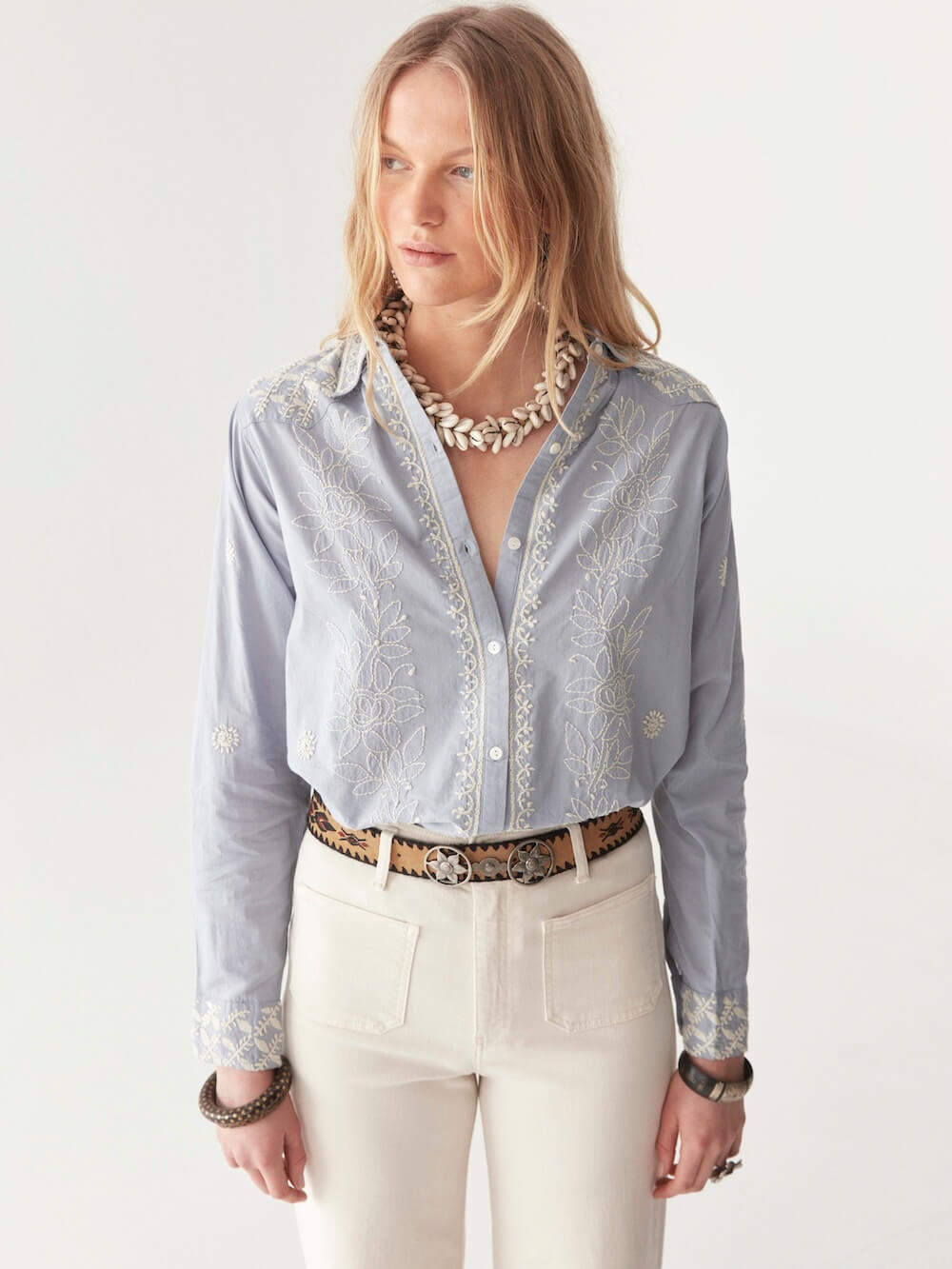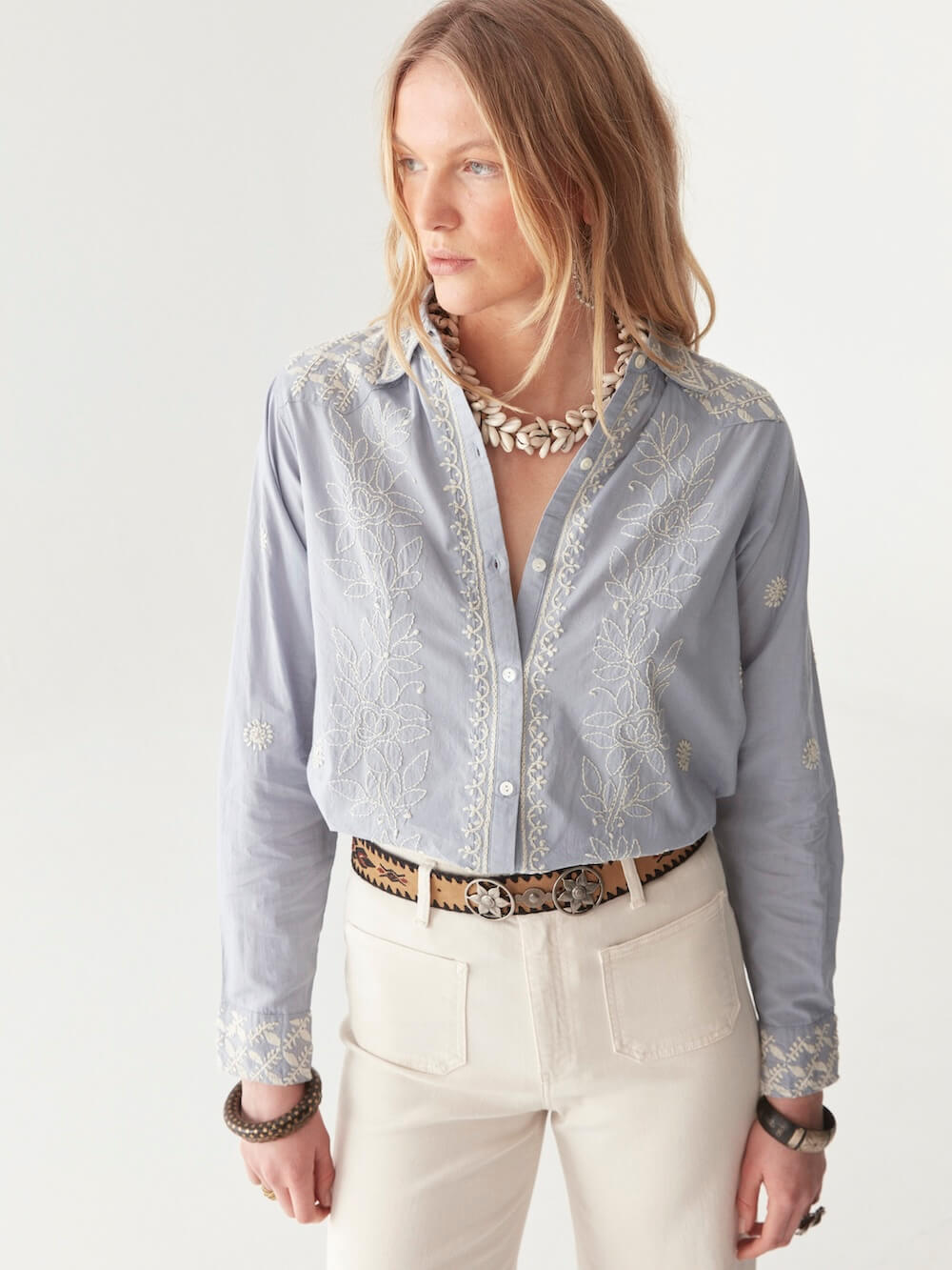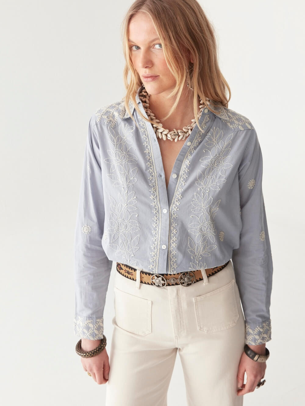 The Ganges Blouse in Indigo by Maison Hotel blends artisanal craftsmanship with effortless wearability. Dyed in a muted indigo (somewhere between dusk and stone) it’s elevated by intricate ivory chikan embroidery, each floral motif structured and deliberate, rather than decorative.