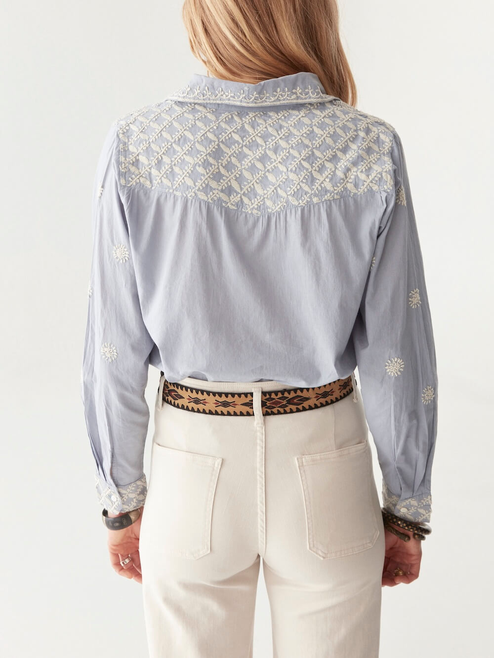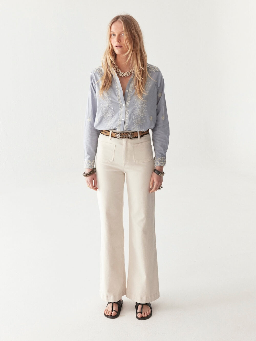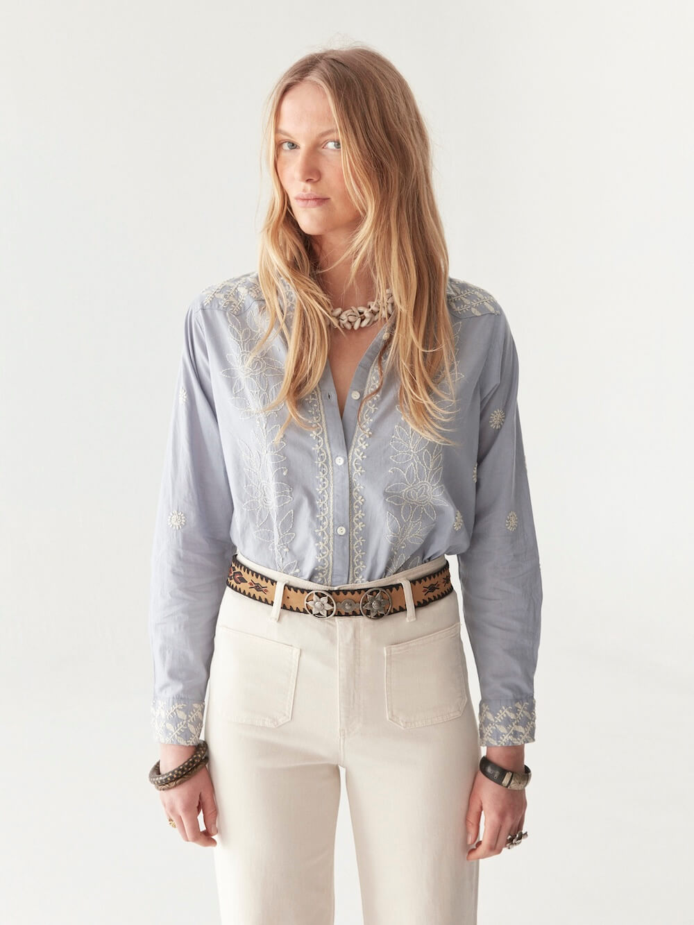 The Ganges Blouse in Indigo by Maison Hotel blends artisanal craftsmanship with effortless wearability. Dyed in a muted indigo (somewhere between dusk and stone) it’s elevated by intricate ivory chikan embroidery, each floral motif structured and deliberate, rather than decorative.