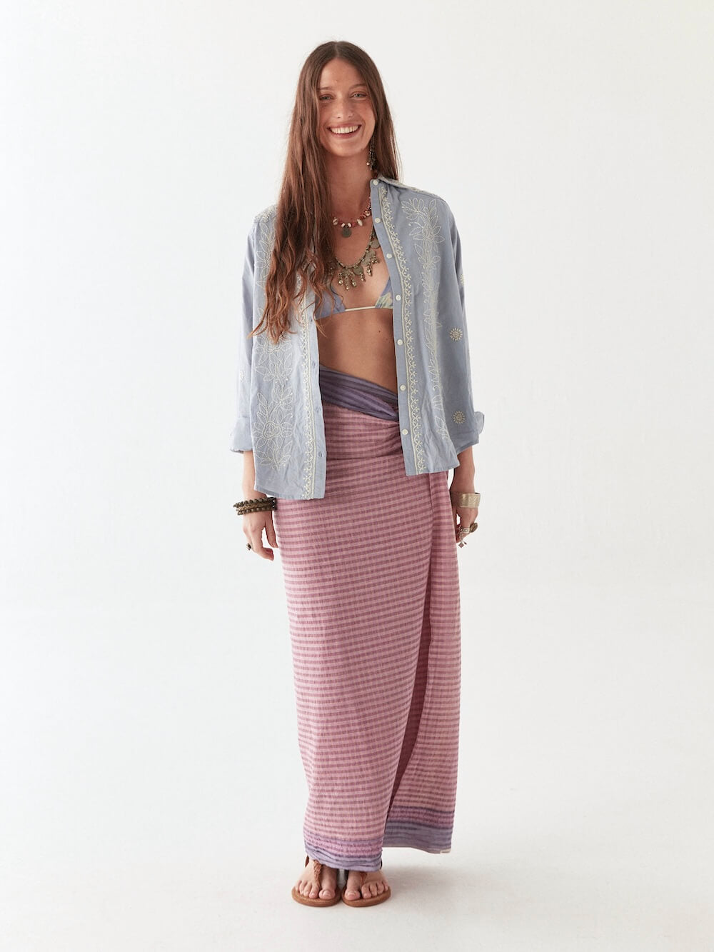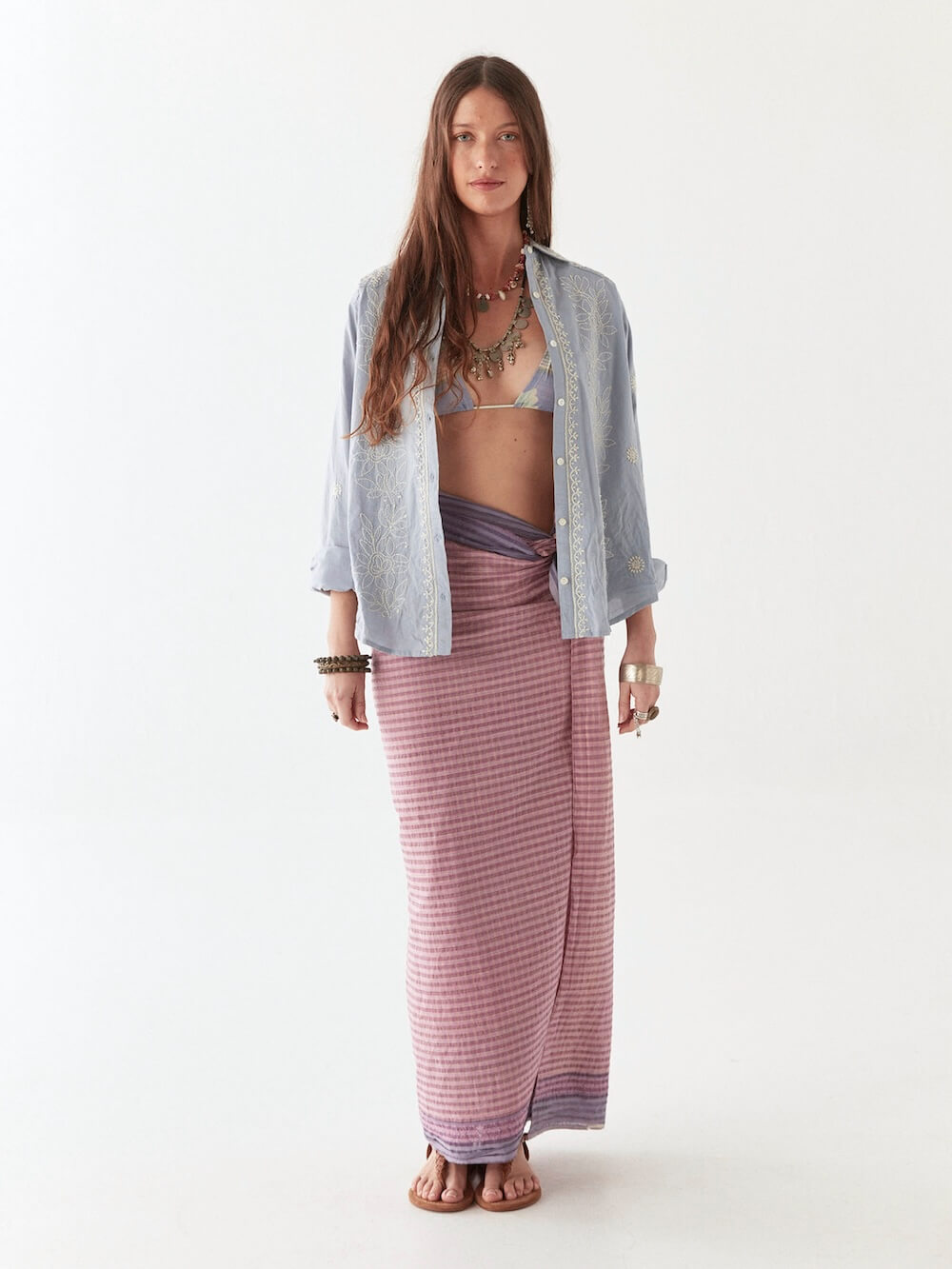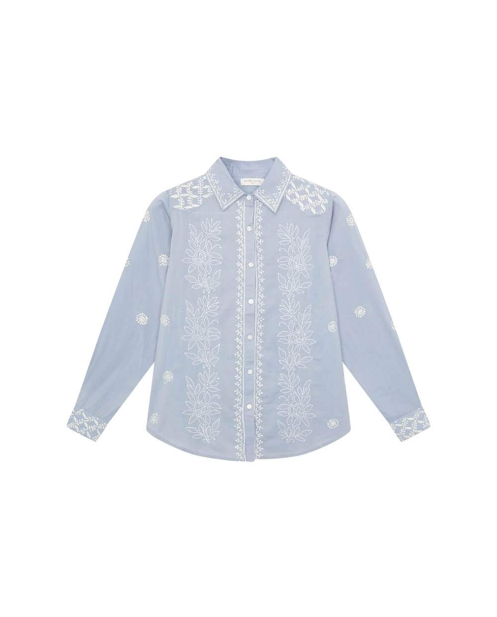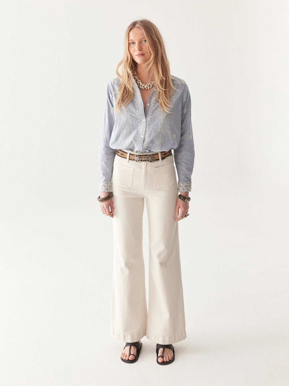 The Ganges Blouse in Indigo by Maison Hotel blends artisanal craftsmanship with effortless wearability. Dyed in a muted indigo (somewhere between dusk and stone) it’s elevated by intricate ivory chikan embroidery, each floral motif structured and deliberate, rather than decorative.