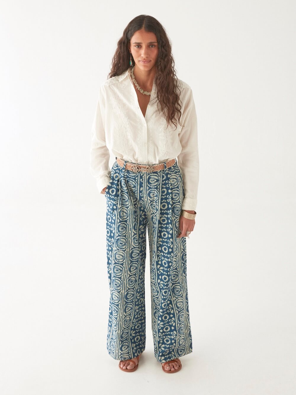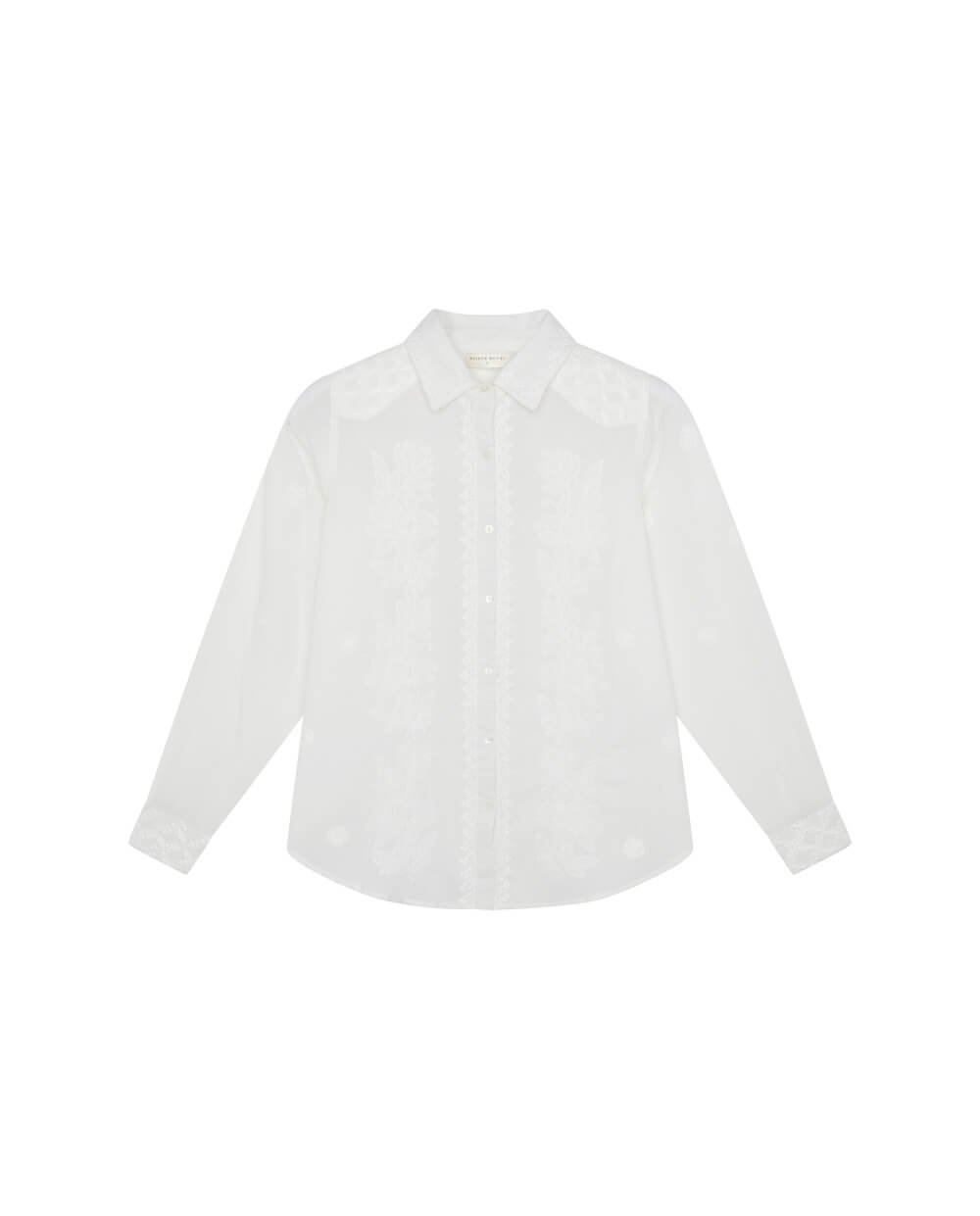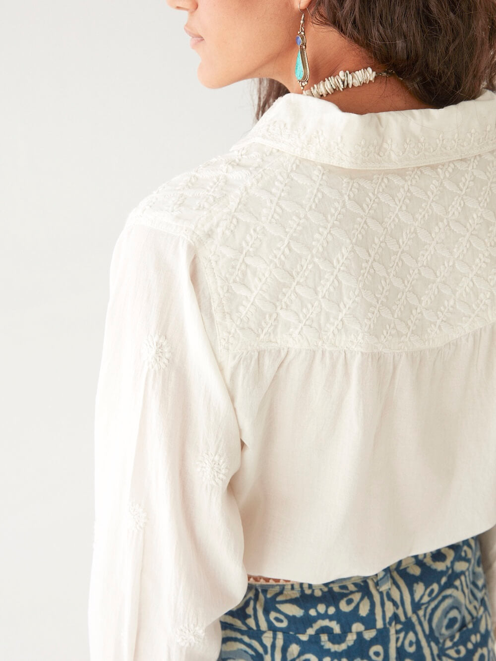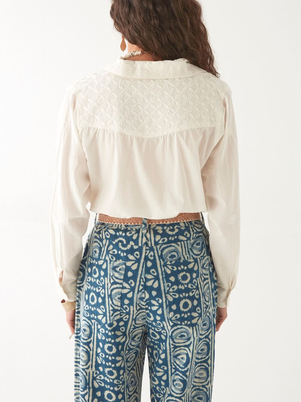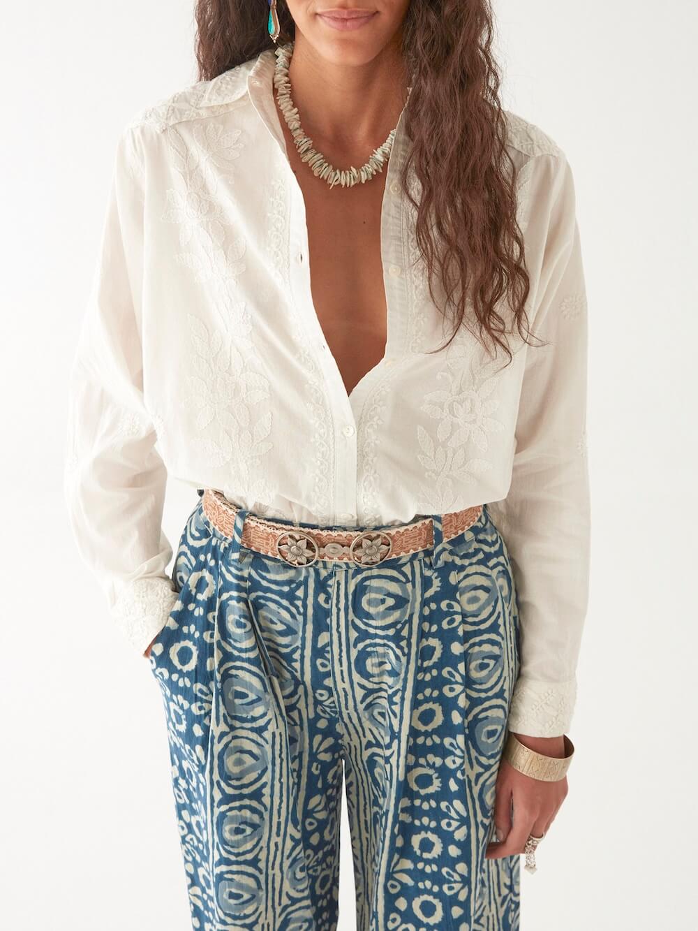 Balancing structure and softness, the blouse features a crisp collar and tailored cuffs, giving sharpness to the fluid silhouette. The embroidery adds depth without overpowering, making it a versatile piece that transitions effortlessly from day to evening.