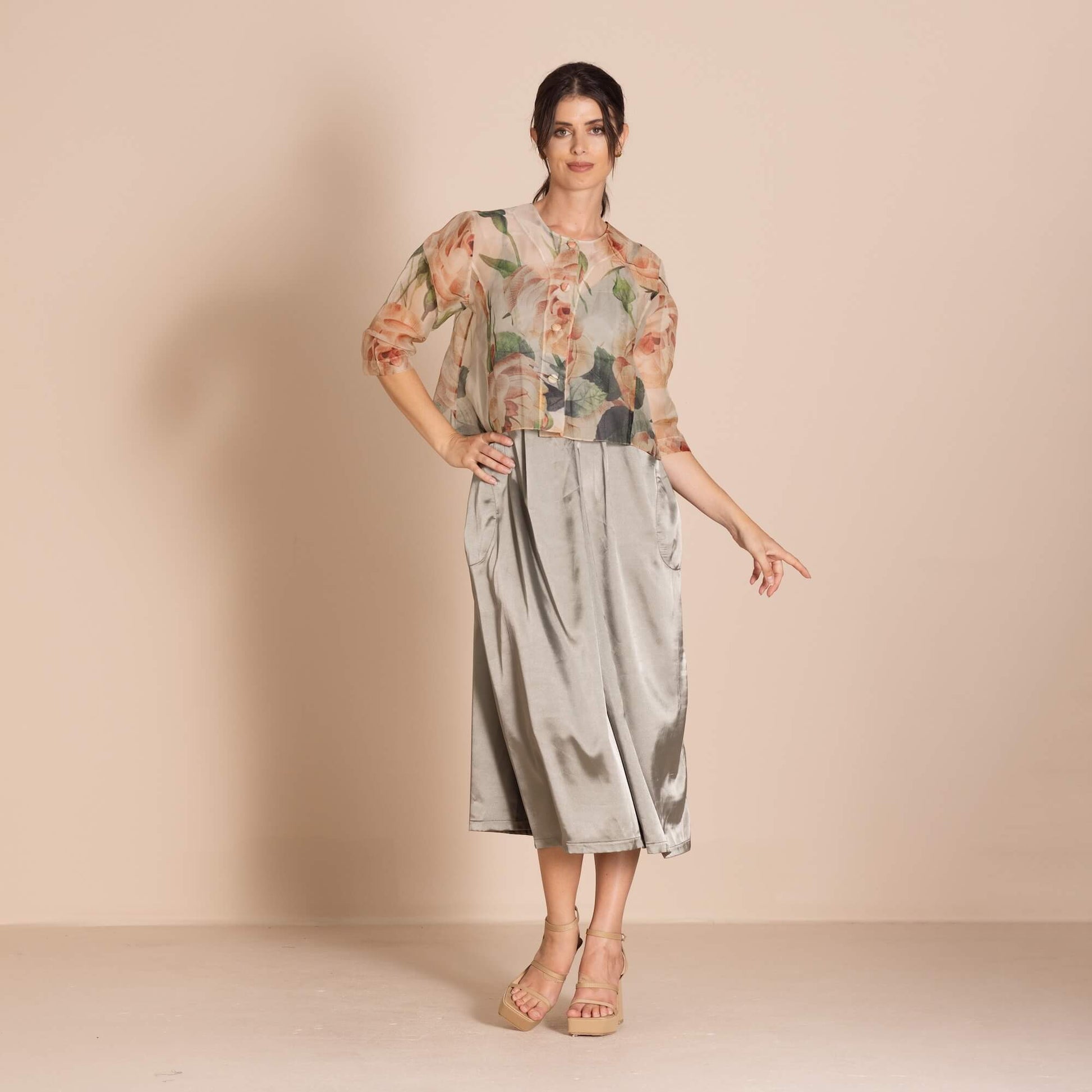 Add a sophisticated finishing touch to your occasionwear with the Roses Silk Organza Birdie Jacket by Megan Salmon. This elegant, lightweight layer features Megan's exclusive Roses print; a romantic floral design inspired by vintage greeting cards, with soft peach blooms and desaturated green foliage on sheer silk organza.